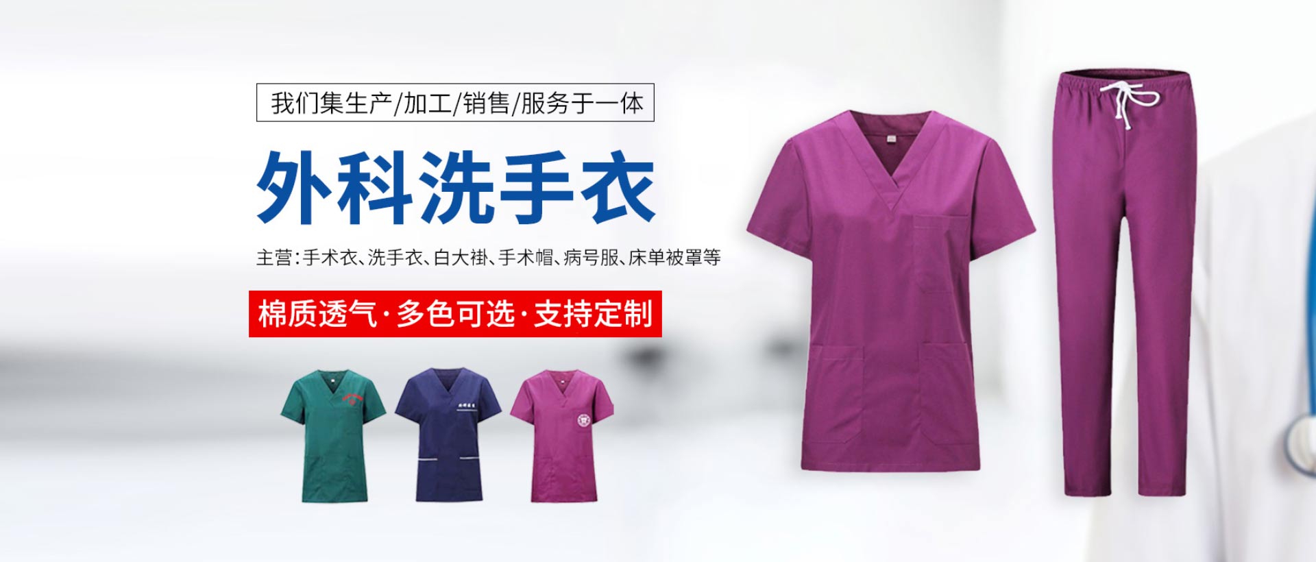 項城市依姿潔服裝有限公司主要生產:護士服夏裝、護士服冬裝、醫生服、病員服、手術服、急救服、護士毛衣、羽絨服、護士鞋、環衛服、床上三件套等。本公司是醫用服裝生產廠家,公司致力于高質量服裝產品的研發和生產,并以客戶為導向,不斷創新,使產品更加專業化、多樣化,根據工作環境不同,配以切合實際的功能性服裝。